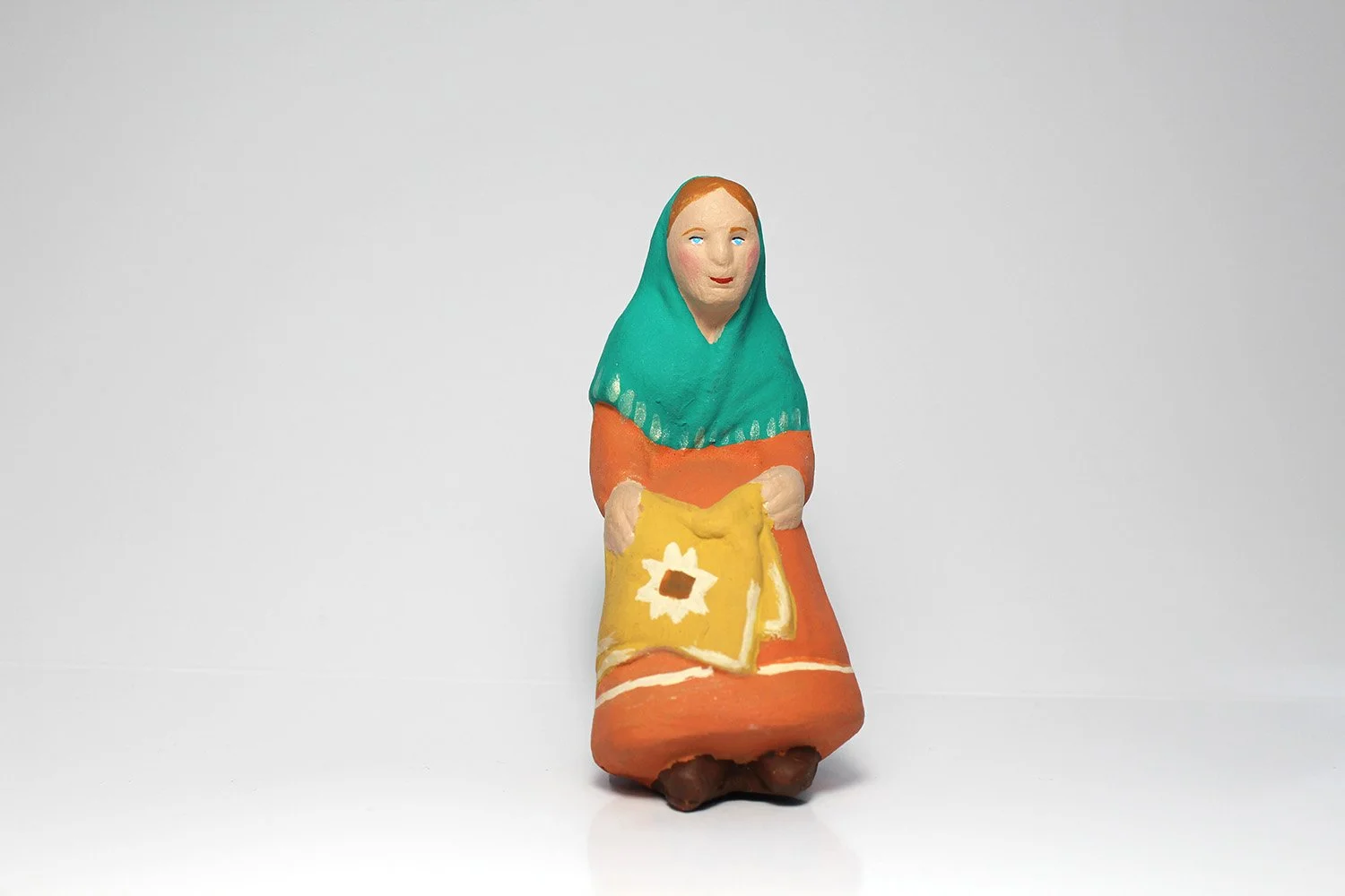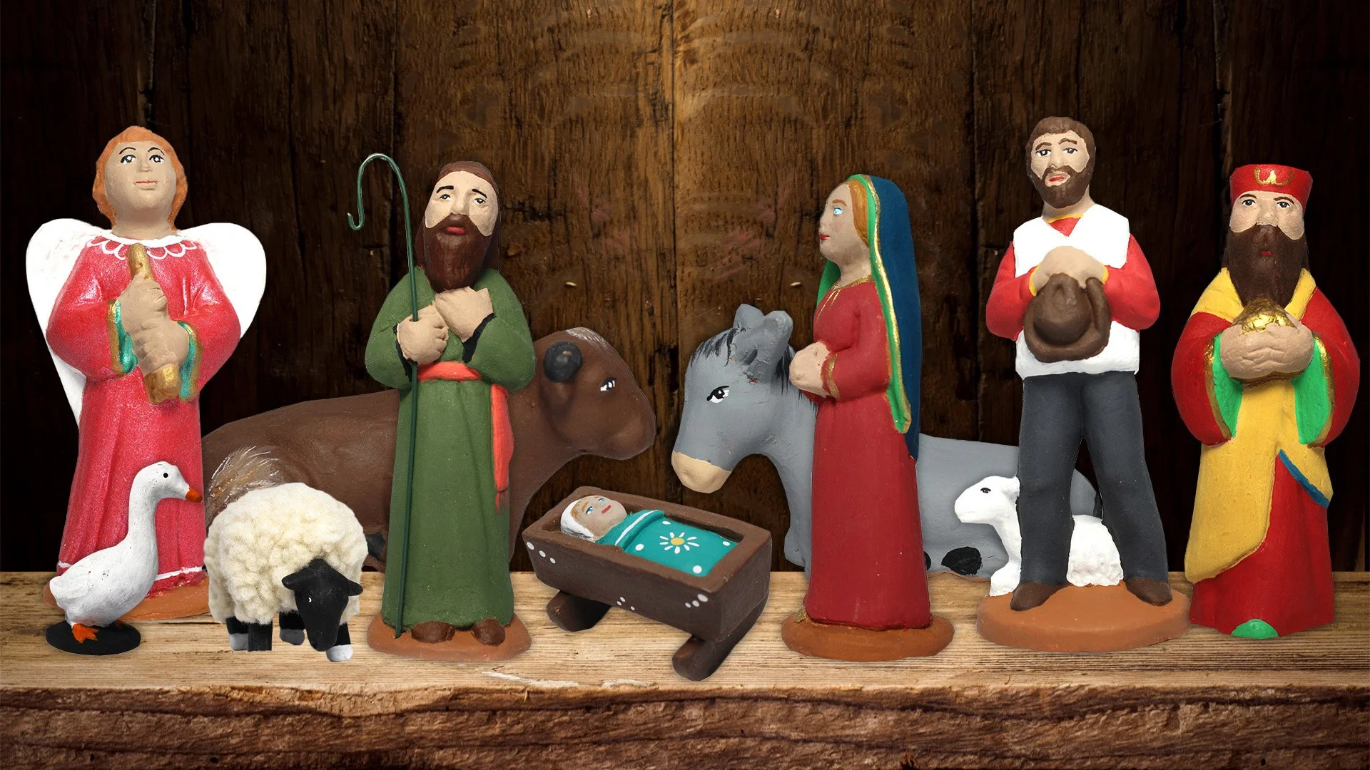 Les santons, ou “petits saints”, s’inscrivent dans une longue tradition provençale. Ce sont de petites figurines en terre cuite, d’environ dix centimètres de hauteur, qui prennent vie dans les crèches de Noël. Elles représentent non seulement la scène de la Nativité, mais aussi tout un village : des personnages du quotidien, leurs gestes, leurs métiers et l’âme des traditions populaires.
